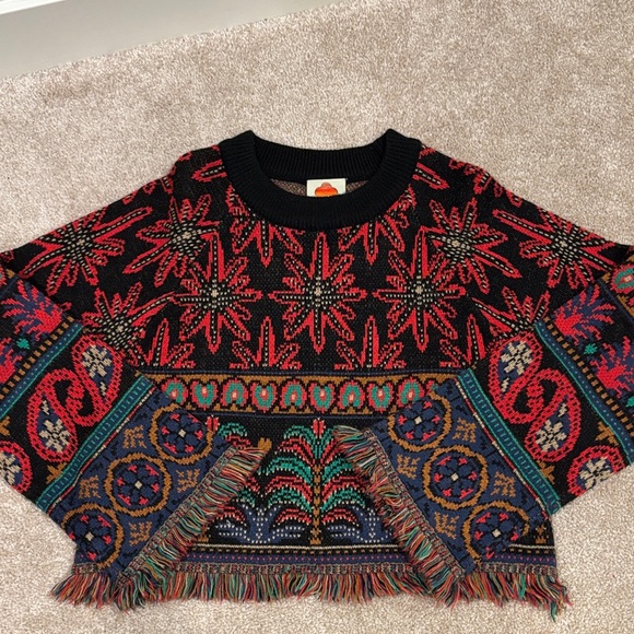 Vibrant knit sweater with intricate patterns. Features red, black, and blue geometric designs. Has fringed sleeves - is cropped.