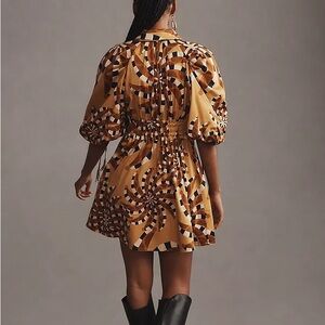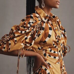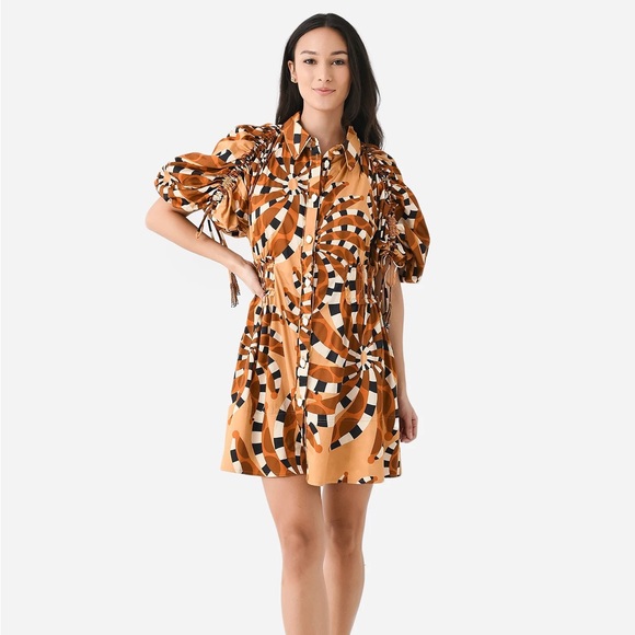 Abstract pattern short dress with amazing details; white buttons, adjustable sleeves, gathered waist, and tassels on sleeve drawstrings. New. Adorable but it runs large. It is not as short as the one in the photo. I think it would fit a size 10 as well as 8.