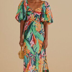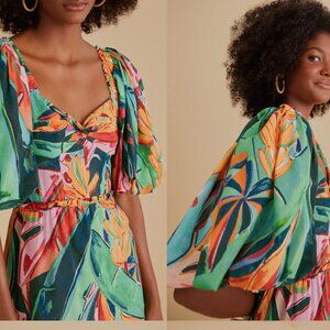 Farm Rio Anthro Women's Banana Foliage multicolor puff sleeve midi dress. Size Medium. New with tags. Perfect condition no flaws. Fully lined, with a hidden zipper closure near rear.