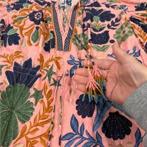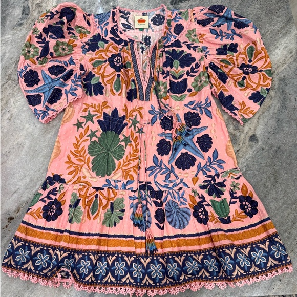 Gorgeous pink multicolor Farm Rio dress, size small. Draw string waist with beaded detail on strings & puff sleeves. Excellent condition.