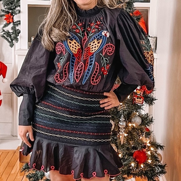 Chic black Farm Rio mini dress. Features vibrant embroidery with birds and floral patterns. Long puff sleeves. Ruffled hem adds flair.