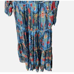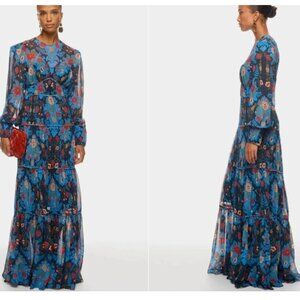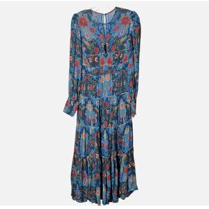 Farm Rio - Women's "Arabesque Floral" gown, maxi length, long-sleeve, chiffon construction, lined, with sheer shoulders and sleeves, puff sleeves with button cuffs, tiered pleated skirt and waist, round neckline, zip back closure, and button/loop neck closure with keyhole neck at back, in blue with a multi-color floral print. Original retail $320.