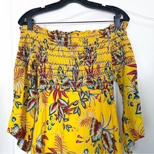 Farm Rio Dress Bria Smocked Mini Floral Off-Shoulder Yellow Multi XS EUC