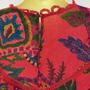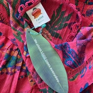 FROM FARM RIO, HERE IS AN AMAZING DRESS FOR DAY TO NIGHT IT IS DONE IN 100% COTTON AND FULLY LINED. THIS ADORABLE FARM IS DONE A RASPBERRY SHADE AND ACCENTED WITH TROPICAL DESIGNS IN GREEN, GOLD AND BLUE. IT FEATURES A SMOCKED DROP SKIRT AND A ROUND NECK WITH LACE DETAILING. THERE ARE 5 BUTTONS IN BACK AND LONG SLEEVES WITH RUFFLE BELL CUFFS. INCLUDED IS A VINTAGE BAG FROM THE SAK THAT MATCHES THE DRESS PERFECTLY. MARKED AN XS, THIS DRESS IS NEW WITH TAGS.IT RUNS LARGE SO PLEASE NOTE THE MEASUREMENTS AND IT DOES HAVE STRETCH.