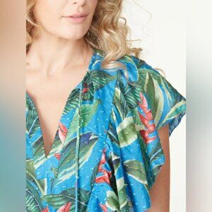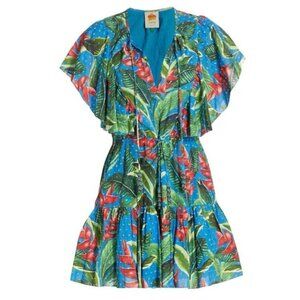 Dream Garden mini dress is a romantic-yet- chic attention grabbing Farm Rio dress featuring a flattering split neckline accentuated with a lace trim and beaded tassels, short ruffled sleeves, an adjustable waistline, an invisible zipper at side seam and an elongated ruffled edge hem. Offers an easy and relaxed fit.