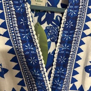 Beautiful Farm Rio blue and white maxi dress, NWT! Size large. I did have a clear snap professionally added to this dress so that the neckline can either be snapped closed or left open!