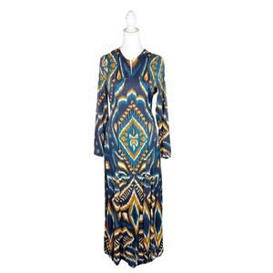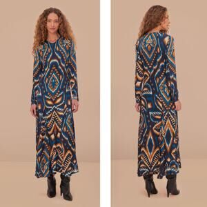 farm rio dress, ikat maxi dress, boho maxi, blue orange print dress, long sleeve maxi, tropical print, sustainable fashion, resort wear, vacation outfit, artistic dress, D1