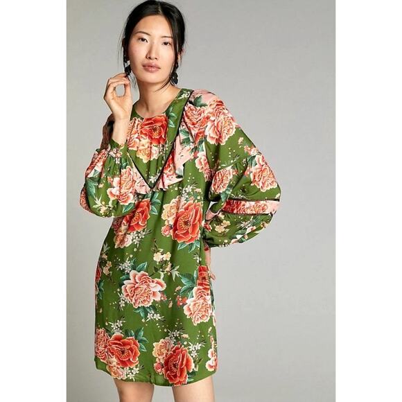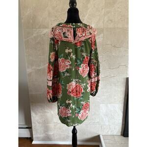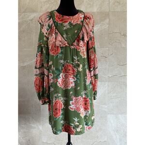 Farm Rio Elinor Tunic Dress - S Green Pink, Floral Long Sleeve Boho Twee Cottage