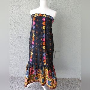 Beautiful Farm Rio for Anthropologie strapless midi dress featuring vibrant embroidered floral details and a rich navy background with colorful border print. This bohemian-inspired dress showcases intricate embroidery along the bodice and hem, creating a striking artisan look.