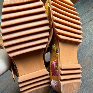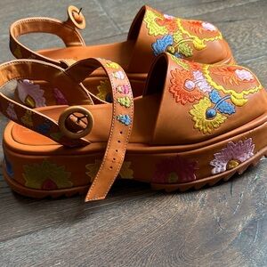 Step out in style with these farm rio vibrant orange/brown platform sandals. Featuring colorful embroidery, these shoes add a playful touch to any outfit. Size 9. Barely worn.