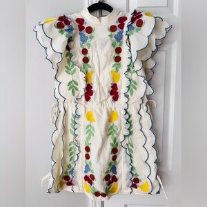Embrace the charm of the Embroidered Ruffle Mini Dress from FARM Rio. This playful piece features charming ruffles at sleeves and along the line, gorgeous embroidered detailing in bright colors and a flattering silhouette. This adorable mini is designed with a drawstring waistline and side ties, breezy silhouette and tear drop button closure at back . The beautiful tropical details brings a touch of Brazilian flair to any wardrobe. Simply an eye-catching dress. Perfect for a day out in the sun or a casual stroll around town over denim shorts , this adorable mini is a must-have for those who love to stand out in style!