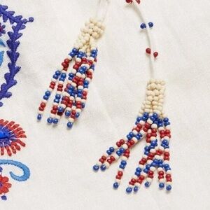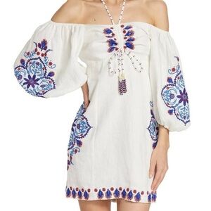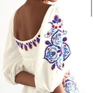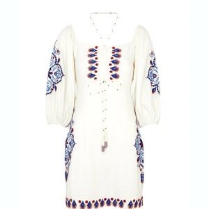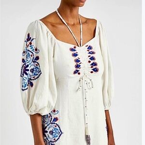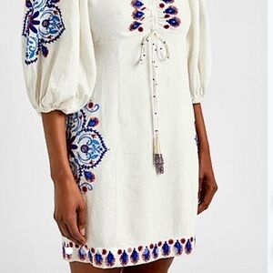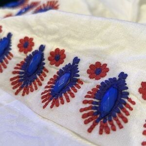 Breathable linen dress with beautiful linen blend embroidery and embellishments through out the sleeves and hem. Puff sleeves, Front tie also embellished with beaded tassels, beaded tie that also creates a halter neck. Lots of details in this beauty. EUC, True to size. Does have two small embellishments that need to be sewn in from one end .