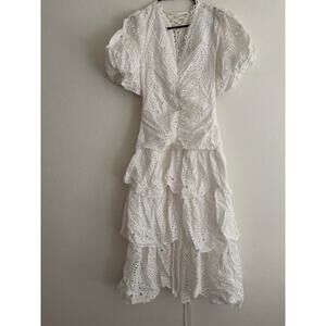 Effortlessly chic and oh-so-comfortable, our White Cotton Eyelet Puff Sleeve Midi Dress is a must-have for any wardrobe. Designed with a V neckline and elbow-length sleeves, this dress embraces both style and comfort. And the invisible zipper at the back adds a touch of practicality to this beautiful piece. This dress is sure to turn heads.