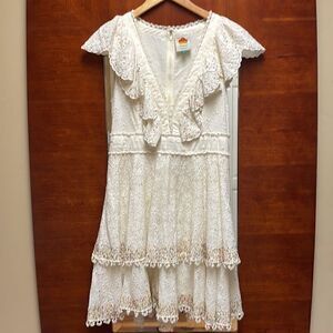 Farm Rio Cream Eyelet Patch Rainbow Beaded Mini Ruffle Dress Size Small. So gorgeous and well-made. Back zipper for easy entry and perfect fit. In great condition! Enjoy!