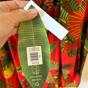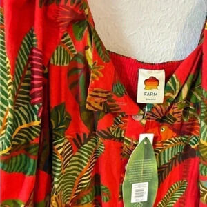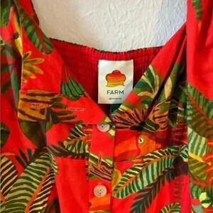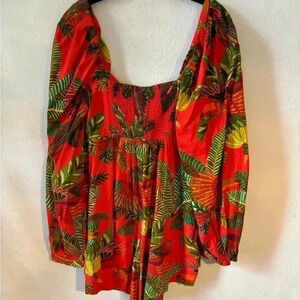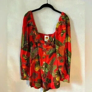 Farm Rio FOREST BIRDS LONG SLEEVE LINEN BLEND ROMPER IN RED FOREST BIRDS