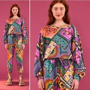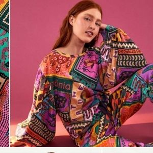 dotted patch sweater- oversized, with extra wide balloon sleeves. with slight elastic taper wrist. tropical, Amazon, with very bright animal print . very generously sized. EUC, NO ISSUES. top only