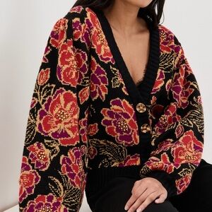 Vibrant floral cardigan with gold buttons. Features red, purple, and yellow flowers on a black background.