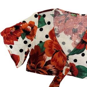 Farm Rio Floral Cropped Linen Blouse Size Small Red 273524