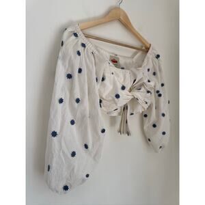 Farm Rio Floral Embroidered Cotton Tie-Front Crop Top - White & Blue XS