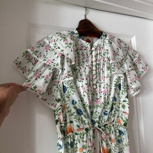 Embrace a blend of folk artistry with the off-white folk floral lace midi dress by FARM Rio. This piece enchants with its high neckline and intricate floral patterns that dance on a canvas of delicate lace. Playful ruffled sleeves add a touch of whimsy, while the midi length offers effortless elegance. Perfect for those who love to express their unique style with grace and color. FARM Rio