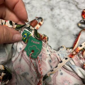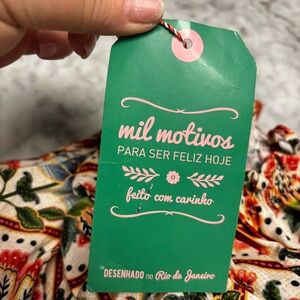 Vibrant floral patterned halter top with adjustable straps. Features red, blue, and cream colors.
