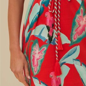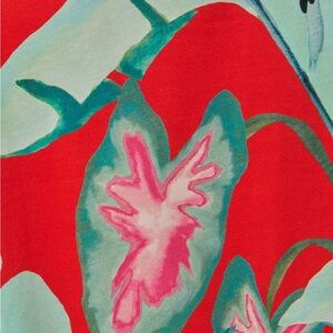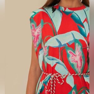 Vibrant floral dress featuring a striking red and green pattern. Perfect for any occasion. Beautiful cords with tassels and shoulder pads.