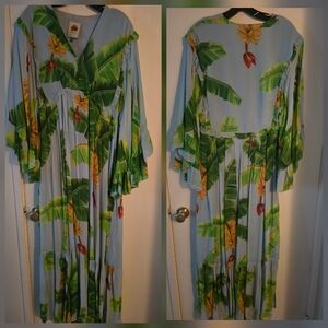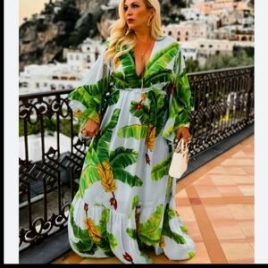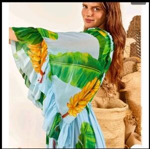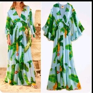 Designed with long butterfly sleeves and a plunging neckline, this Fresh Bananas maxi-dress by Farm Rio features delicate ruffle trim and a concealed zipper at the side seam.