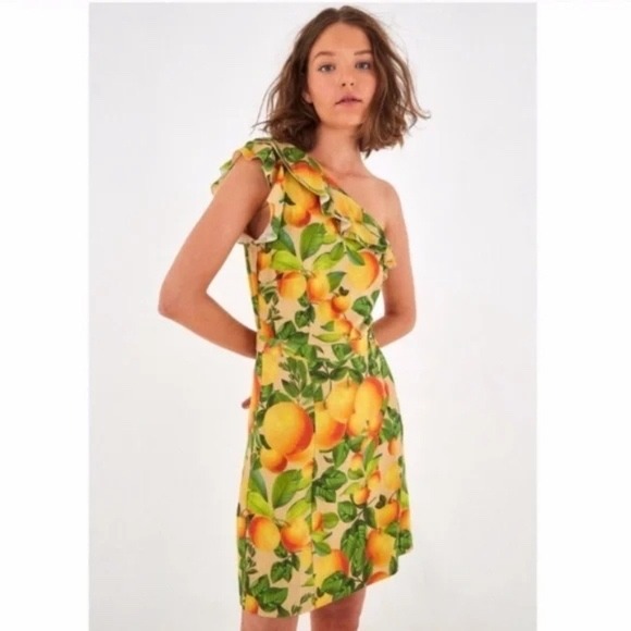 Keywords: FARM Rio dress, one shoulder dress, ruffle dress, mini dress, peach print dress, fruit print dress, women's dress, summer dress, party dress, tropical dress, vacation dress, size S dress, boho dress, brazilian fashion