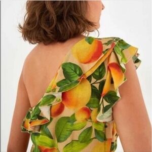 Embrace your vibrant side with this charming FARM Rio dress, where every detail tells a story of sun-kissed orchards and playful sophistication. A cascade of ruffles dances along the one-shoulder neckline, adding a flirty touch to the dress's silhouette. The bold peach and leaf print pops against a neutral backdrop, creating a look that's both eye-catching and effortlessly chic. This dress features a flattering cinched waist, enhancing your natural shape and adding to its feminine appeal. Perfect for a garden party, a sunny brunch with friends, or a romantic evening stroll, this dress is ready to add a touch of Brazilian flair to any occasion.