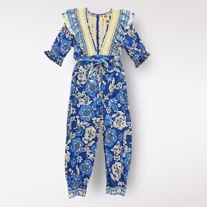 Farm Rio Full of Flowers Jumpsuit Blue Crochet Lace, ties at waist, zip closure, hook and eye, puff half sleeve at V-Neck Size M