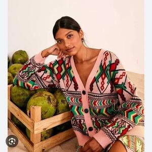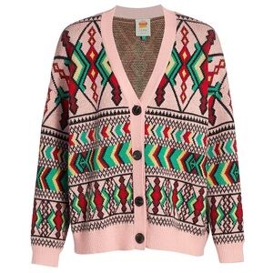 Vibrant knit cardigan with geometric patterns. Features red, green, and pink colors. Perfect for adding a pop of color to your outfit.