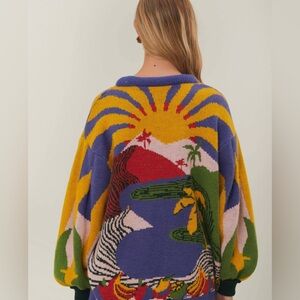 Embrace joy with the Happiness Sweater from FARM Rio. Vibrant hues of yellow, purple, and green come together in a tropical tapestry, featuring a parrot centerpiece that symbolizes the spirit of adventure. The round neckline and relaxed silhouette echo a sense of ease and comfort. Its bold, sunny graphics are an ode to warmth and vivacity, perfect for wrapping yourself in happiness on any day.