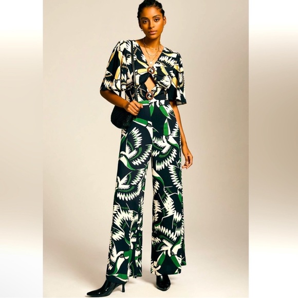 Elevate your wardrobe with this chic yellow and green patterned jumpsuit with the signature Farm Rio toucans. Perfect for any occasion, it offers both comfort and style.