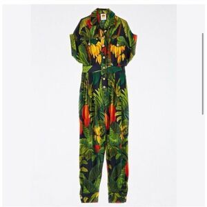 Turn heads this season with this stunning Farm Rio jumpsuit in a size Small. Featuring a rich forest green tropical-inspired print and detailed with chic wooden buttons, this lightweight one-piece is perfect for everything from summer vacations to festive gatherings.