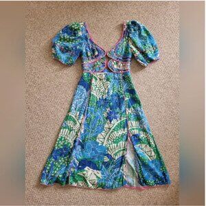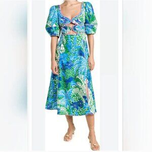 Farm Rio Jungle Panther Puff-Sleeve Cutout Midi Dress size S