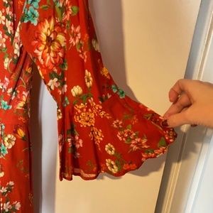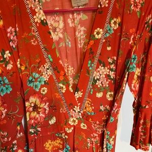 Vibrant, fun, and super flattering! This Kenzie Wrap dress by Farm Rio (from Anthropologie) is always a hit. Where the dress overlaps in the front is slightly higher than the back. You'll also see that there is a clasp if you'd like a more modest neckline (as shown on the model). The dress is slightly lower cut without the clasp. Only worn a couple times; condition is like new.