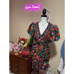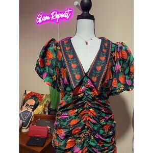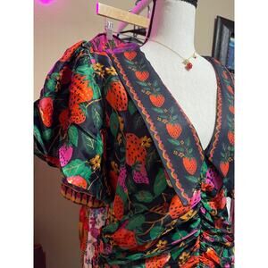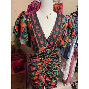 Farm Rio's mini dress is printed with an array of strawberries that give it a vintage-inspired charm. Made from twill, it's ruched through the skirt and has puffed sleeves with padded shoulders for added volume. Style yours with a bright clutch for an extra pop of color. NWT. PTP is 18”, 36” long from shoulder.