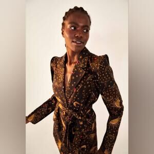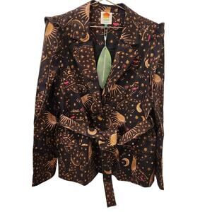 Farm Rio Leopard Sky Celestial Puff Sleeve Belted Blazer brown Jacket size large