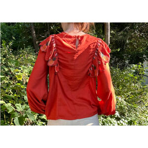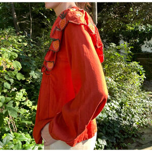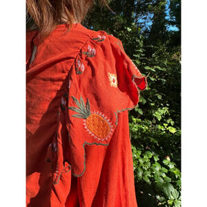 Gorgeous Farm Rio top with detailed embroidery and lots of fun themes! Made from a 55% linen / 45% viscose blend in a beautiful reddish orange color. Embroidery features pineapples, mirrors, Jaguars, hearts, leaves and other geometric designs. Hues are sage, marigold, olive green, red, orange, cream, & pink. Flutter detail at sides of front and around to back of arms. Unique & beautiful, the pics speak for themselves! Purchased at a Farm Rio store in Brasil. Tags are in Portuguese.