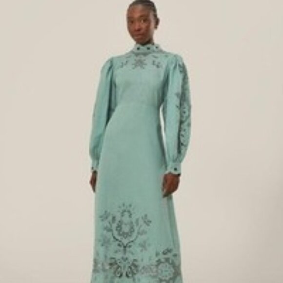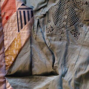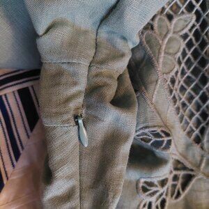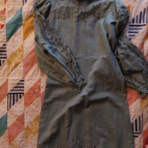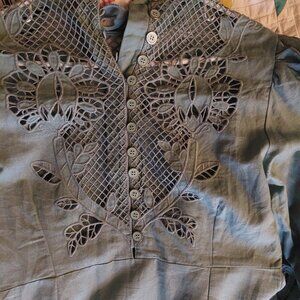 This is a gorgeous gem from Farm Rio -- linen/cotton blend makes this soft and comfortable, with latticing at the sleeves and back. Functional buttons for the mock neck, but a side-zip to help make in an out efficient. I wore this dress once for an early spring farm wedding. Dry cleaned and ready for its next adventure with you! There is the smallest loosening of threads at the zipper (pictured and not noticeable when worn). The tag showed through on the back latticing, so I removed those, but the materials tag is still intact. Size Medium, good fit for a 6-8.