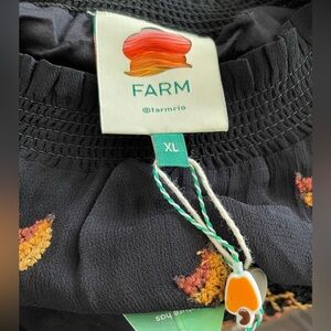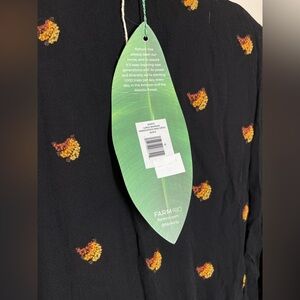 Farm Rio long sleeve crepe mini dress in a women’s XL. Sleeves are sheer with elastic cuffs with smocking around waist for a comfortable fit, along with a high neck. Black with hints of orange and brown. Tiny banana bunches embroidered on upper and lower.