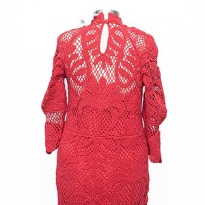 Farm Rio Long Sleeve Lace Knit Midi Dress. This striking midi dress turns heads with its intricate open-knit lace and vivid red hue, blending vintage-inspired texture with modern edge. Designed with a high neckline, puffed long sleeves, and a flattering side slit, it’s both bold and feminine. The cotton crochet overlay is fully lined for coverage, while a back keyhole with button-and-loop closure adds a delicate finish. Perfect for standout moments year-round.