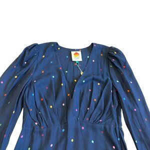 Farm Rio Lucy Dots V-Neck Dress Navy Colorful Long Sleeve Shift Size Small NWT