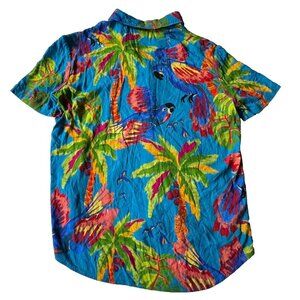 Good used condition. Unisex top in a colorful tropical parrot pattern with blue as the main background color. Buttons like a mens, but can be worn unisex adult. Runs loose. Thanks for stopping by!
