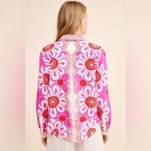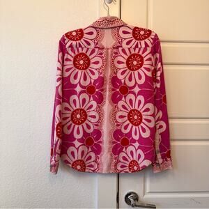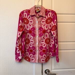 Vibrant pink floral design. Long sleeves. Button-up front. Perfect for a bold look.