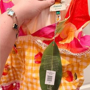 Vibrant maxi dress with a patchwork design. Features pink, yellow, and orange patterns. Perfect for a bold, summery look.