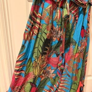 Escape to the tropics in this absolutely stunning, brand-new Farm Rio maxi dress. The vibrant blue background makes the lush tropical jungle print—full of ferns, flowers, and bright leaves—pop!