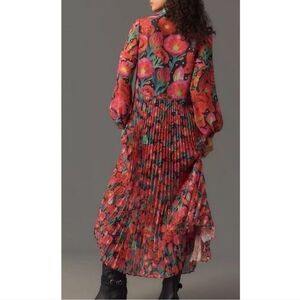 Farm Rio Maxi Dress Womens S Floral Sheer Pleated NWT. This shirt dress is a gorgeous floral print on a sheer fabric. It features a collar, balloon sleeves with pleated shoulders, button down covered, and a full pleated maxi skirt. It has a black slip lining underneath. Polyester. NWT. Please look at pictures closely and ask questions before buying. BUNDLE MULTIPLE ITEMS AND SAVE. Nonsmoking home. Thank you.