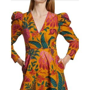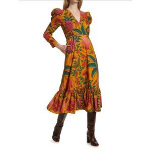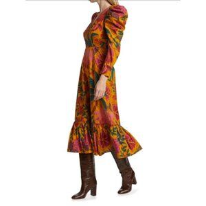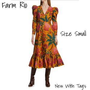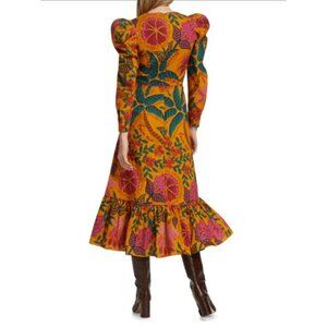 Farm Rio Midi Dress Puff Long Sleeve Print Cotton Yellow Small New With Tag