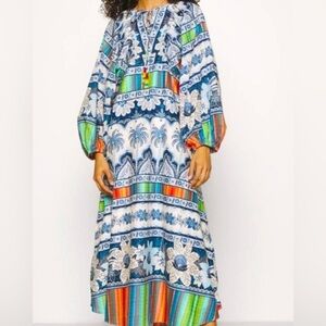 FARM RIO Multicolor Floral Tropical Printed Midi Maxi Dress w/ Beaded Tassels & Voluminous Balloon Sleeves.